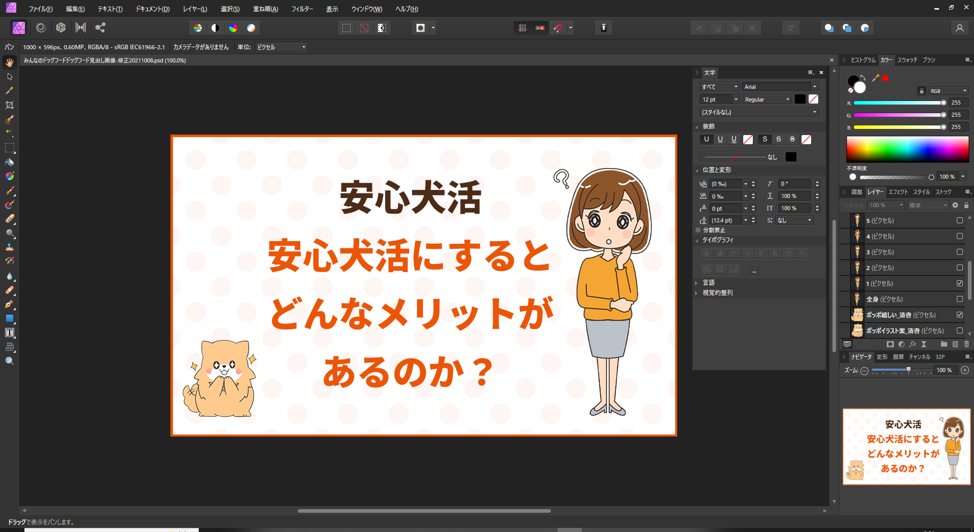 見出しの文字の内容に合うキャラクターのレイヤーを選択してください。上記の例では「安心犬活にするとどんなメリットがあるのか?」という疑問形なので、キャラクターもはてなマーク付きの表情を選択しています。